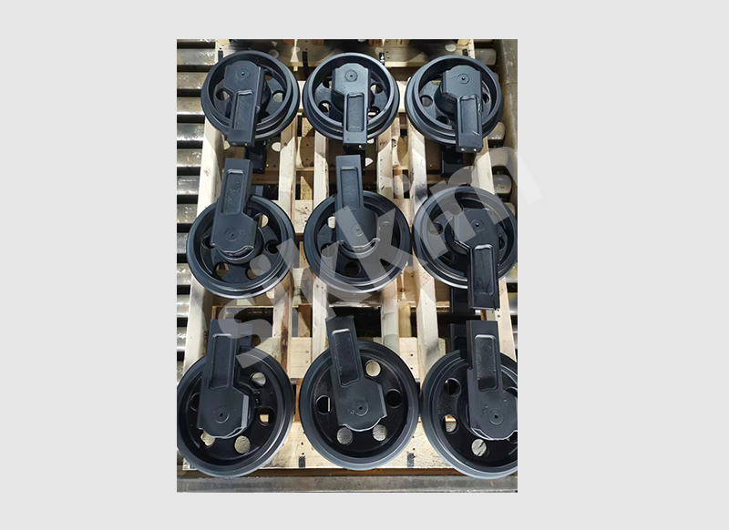 引导轮由引导轮和装在支架内部的涨紧弹簧、油缸等组成,用来引导履带正确运转,起到防止履带跑偏、脱轨和调节履带松紧度等作用。